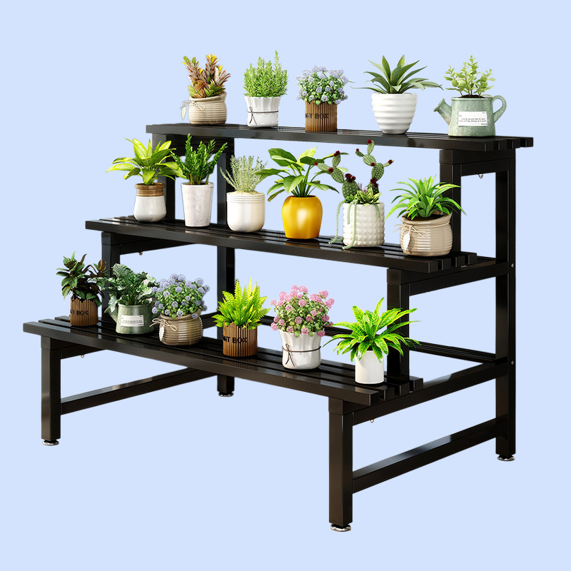 耐久性の高い鉄製多層階段式花棚。省スペース設計で植物を美しく陳列。組立簡単、防錆加工で屋内外に最適。多様な植物収納可能。